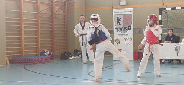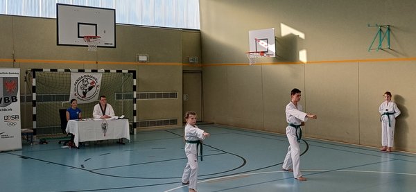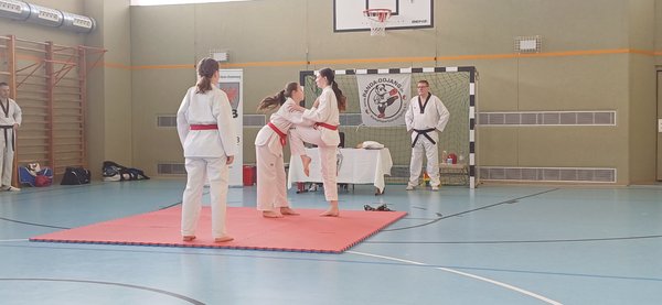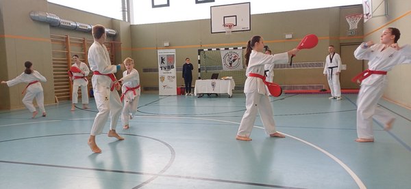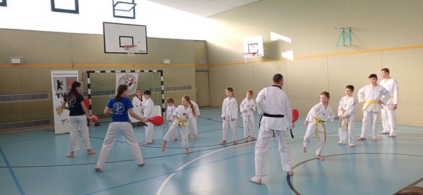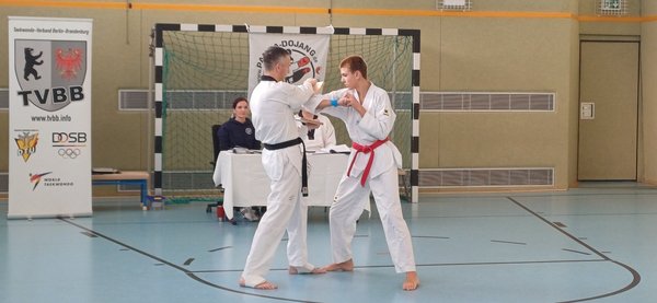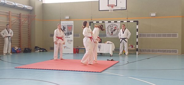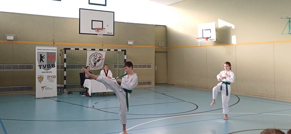 Alle 21 Taekwondo-Sportler überzeugten in den verschiedenen Prüfungsteilen wie Grundschule, dem Formenlauf ( Poomsae ), Sparring mit der Pratze oder dem wettkampforientierten Freikampf sowie den beiden Höhepunkten zum Ende. Denn dort konnte dem Publikum eine wahrlich vorführreife Anschauung zum Thema Selbstverteidigung präsentiert werden, bevor sich zwei Jugendliche den erfolgreichen Bruchtest ( das Zerschlagen/-treten eines Brettes ) stellten.